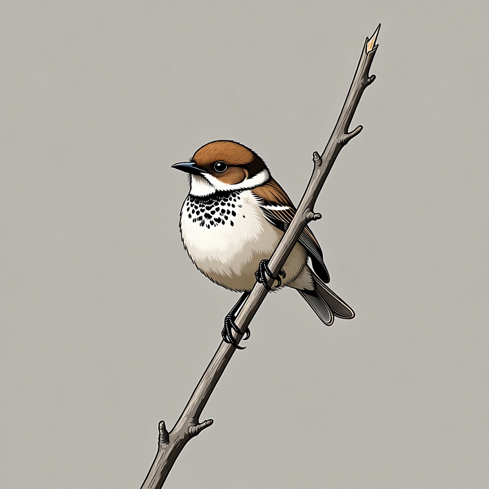 A detailed illustration of a small sparrow with brown head, white throat with black spots, and white underbelly perches on a thin branch. The bird faces left with a sharp beak and dark eyes. It is set against a plain gray background.