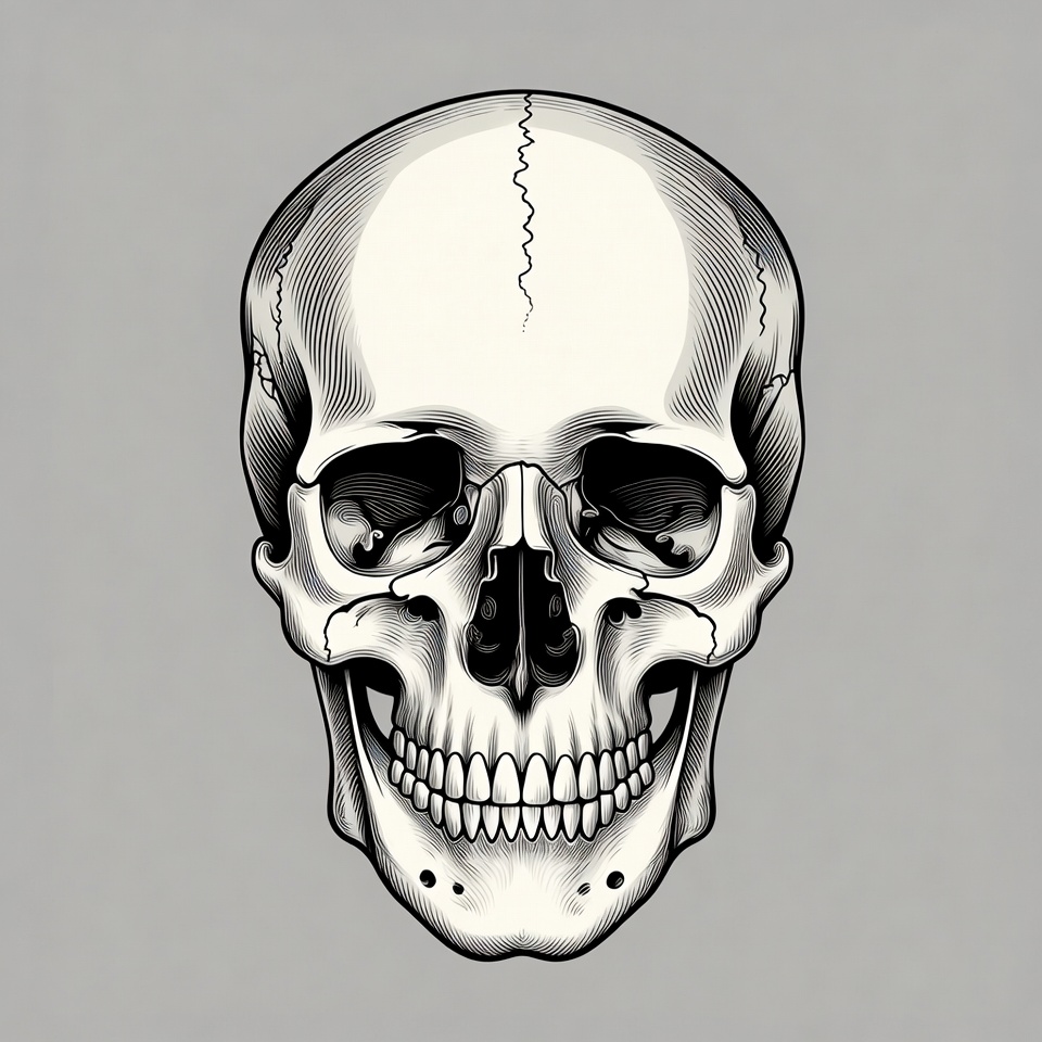 anatomy, black and white, bones, death symbol, drawing, front view, grayscale, human skull, illustration, ink art, isolated background, line art, skeleton head, skull