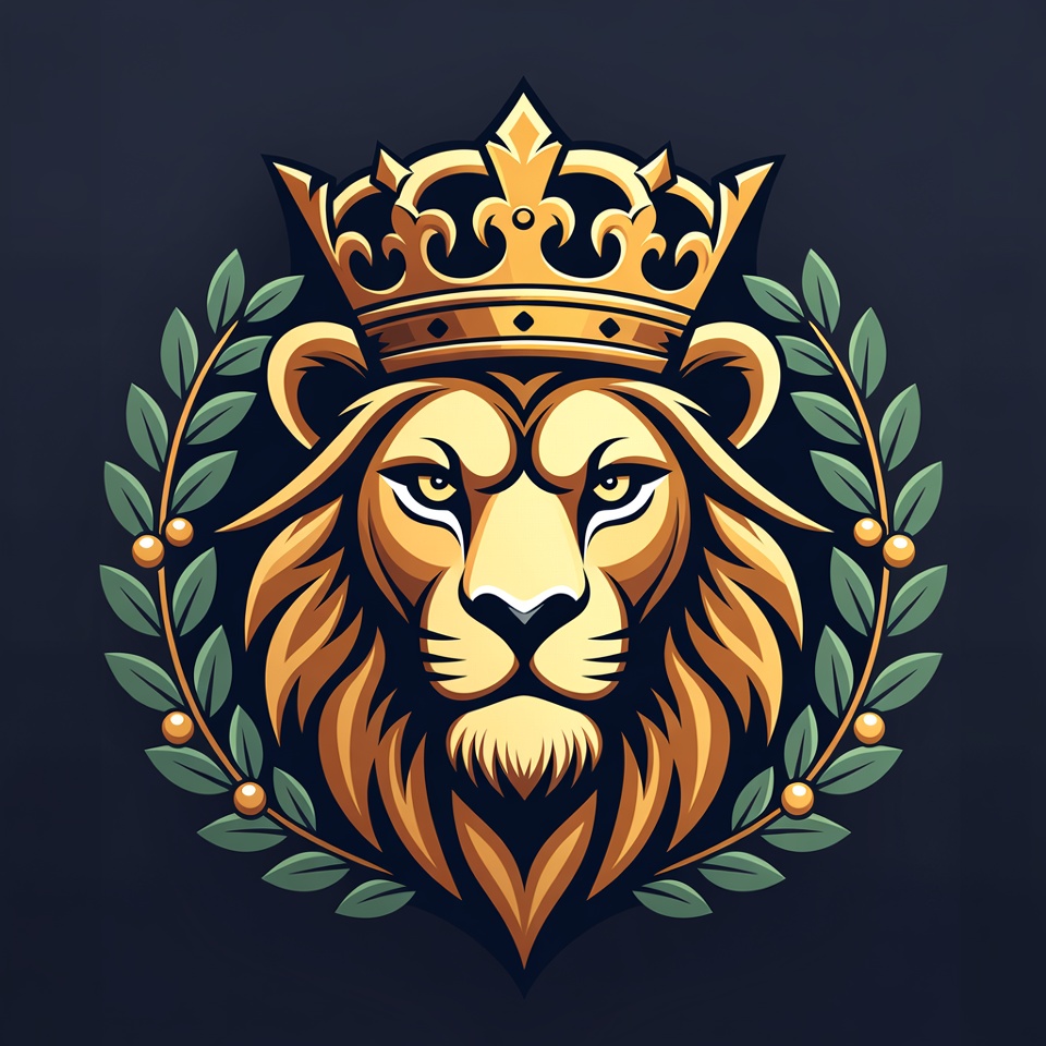 animal illustration, berries, crown, crowned lion, dark background, emblem, fierce lion, gold lion, golden crown, graphic design, green leaves, illustration, isolated background, king lion, laurel leaves, laurel wreath, lion head, lion king, logo, majestic lion, orange berries, royalty, vector art, lion