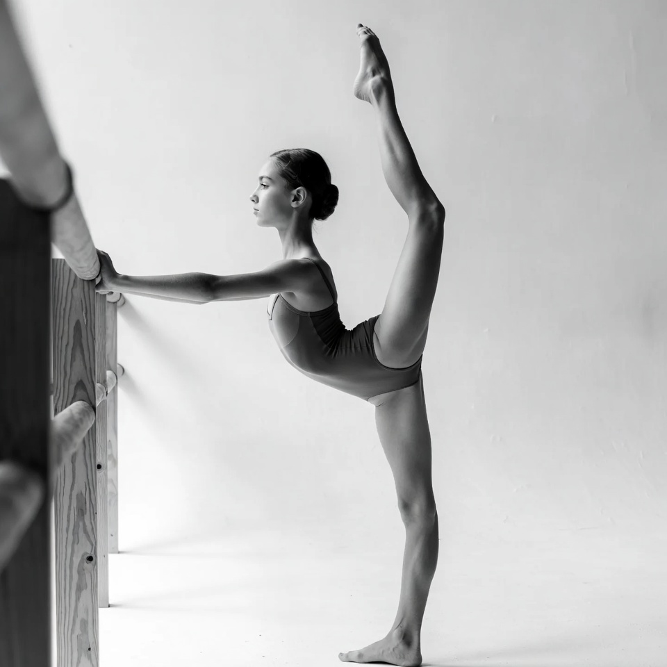 A young girl with her hair in a bun performs a high leg split while holding onto a wooden ballet barre. She wears a tight leotard and stands on one foot with the other extended straight up. The image is in black and white against a plain white background.