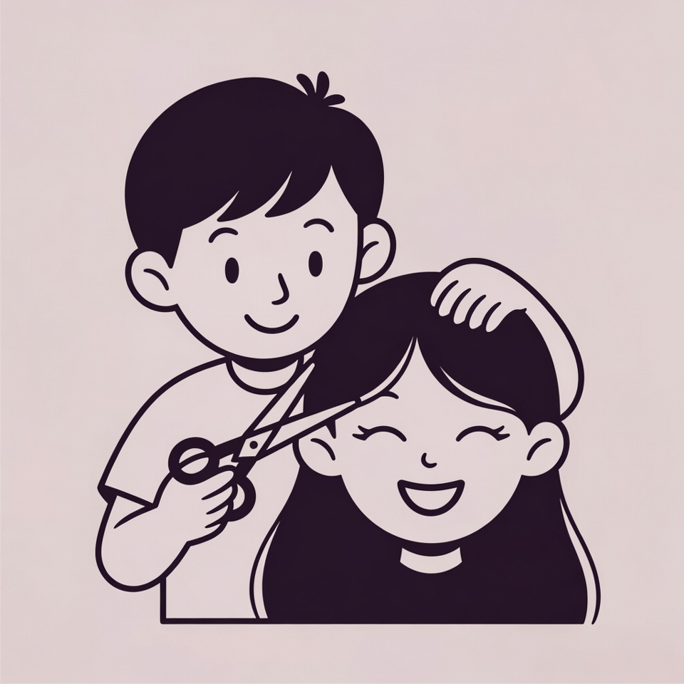 A black line art illustration shows a smiling boy holding scissors and cutting the long hair of a seated girl. The boy stands behind her with his arm around her shoulder, both with cheerful expressions and large eyes. The image features simple cartoon style on a plain background.