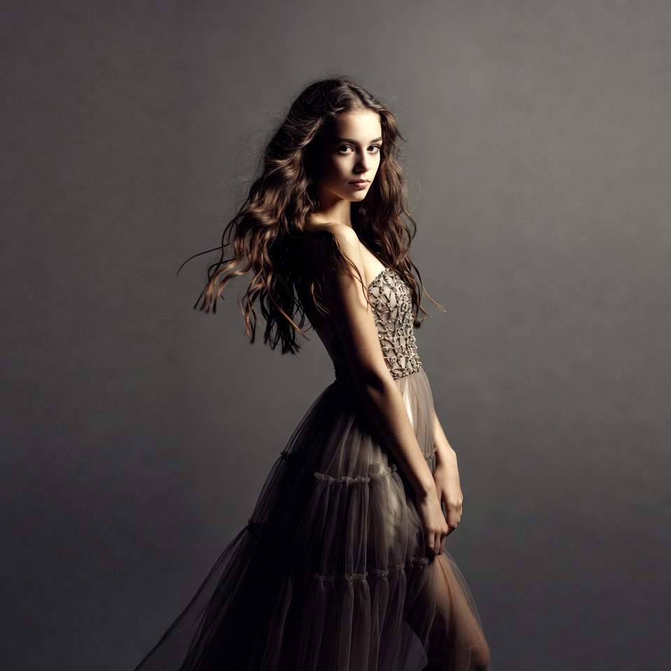 A young woman with long wavy brown hair stands in profile against a dark gray background. She wears a strapless beaded gray tulle gown with layered skirt that flows elegantly. Her hair billows slightly as she poses gracefully.