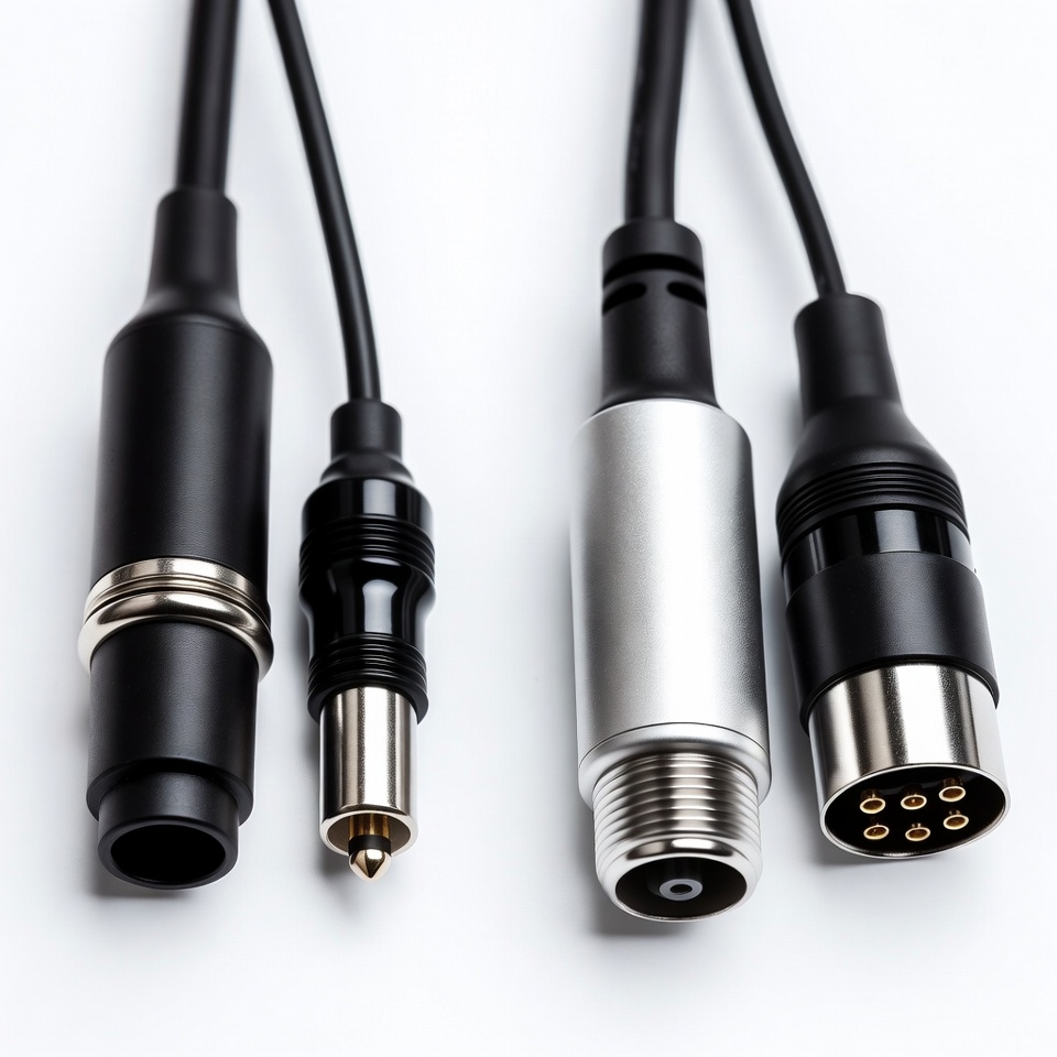 DIN connector, RCA plug, XLR plug, audio cables, audio equipment, black plugs, cable plugs, electronic connectors, isolated, metal contacts, mini DIN, pin connectors, plugs, silver connector, white background, wiring connectors, audio connectors