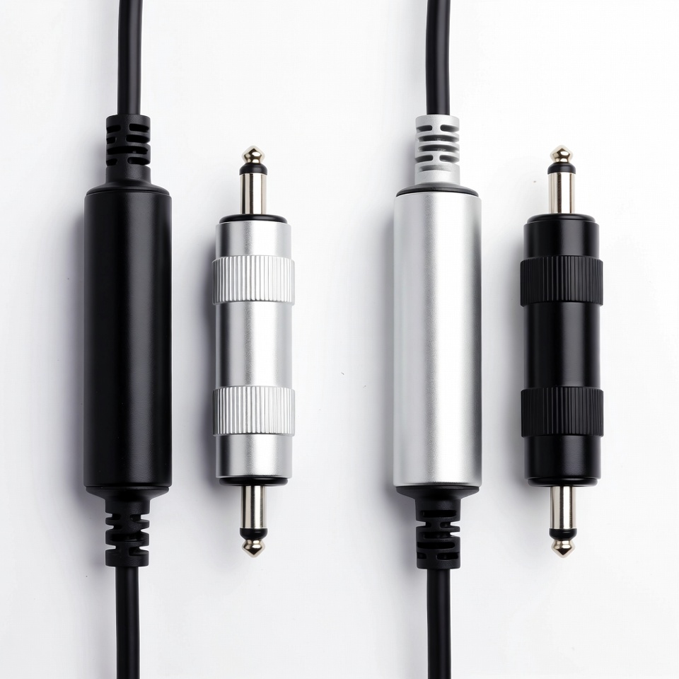 Four 3.5mm audio jack plugs are arranged on a white background. Two are black with knurled grips and attached cables, while two are silver with similar designs. The plugs feature gold-colored tips and are shown from a top-down view.