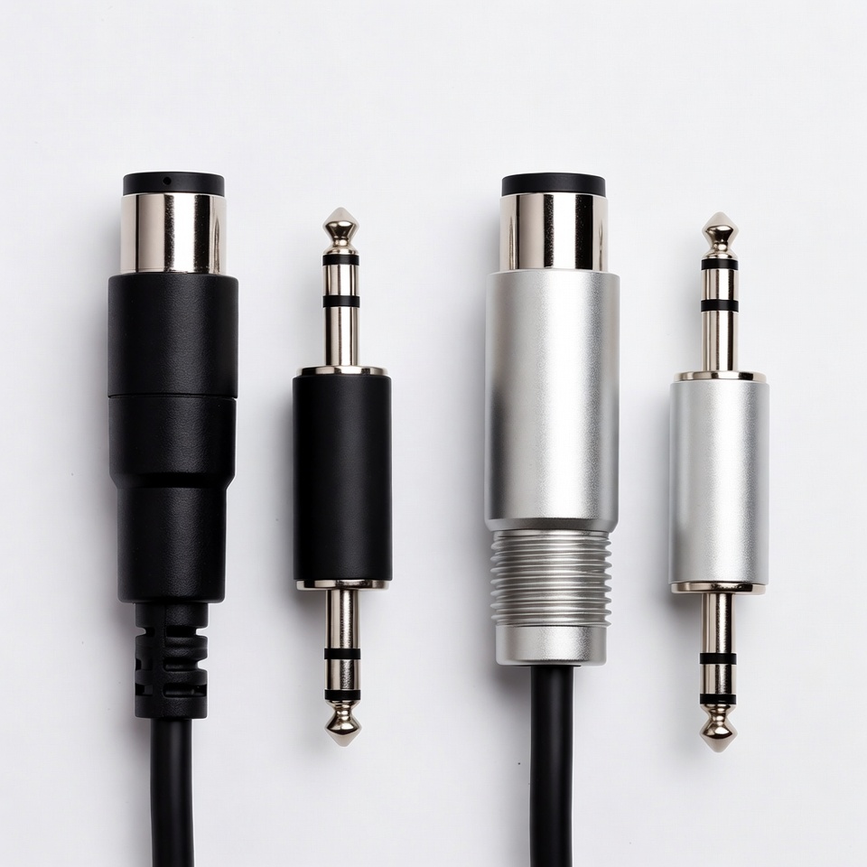 3.5mm jack, 5-pin MIDI, DIN connector, audio cable, audio jack, black cable, electronics, hardware, instrument cable, isolated background, music equipment, plug connector, professional audio, silver cable, sound cable, synthesizer cable, white background, MIDI cable