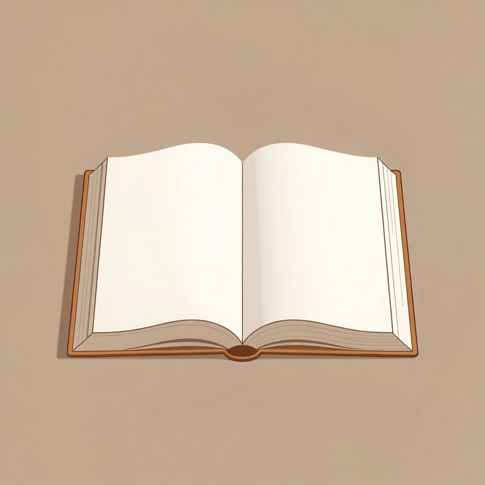 A simple illustration of an open book with blank white pages and brown leather cover. The book lies flat on a beige background. Subtle shadows add depth to the design.