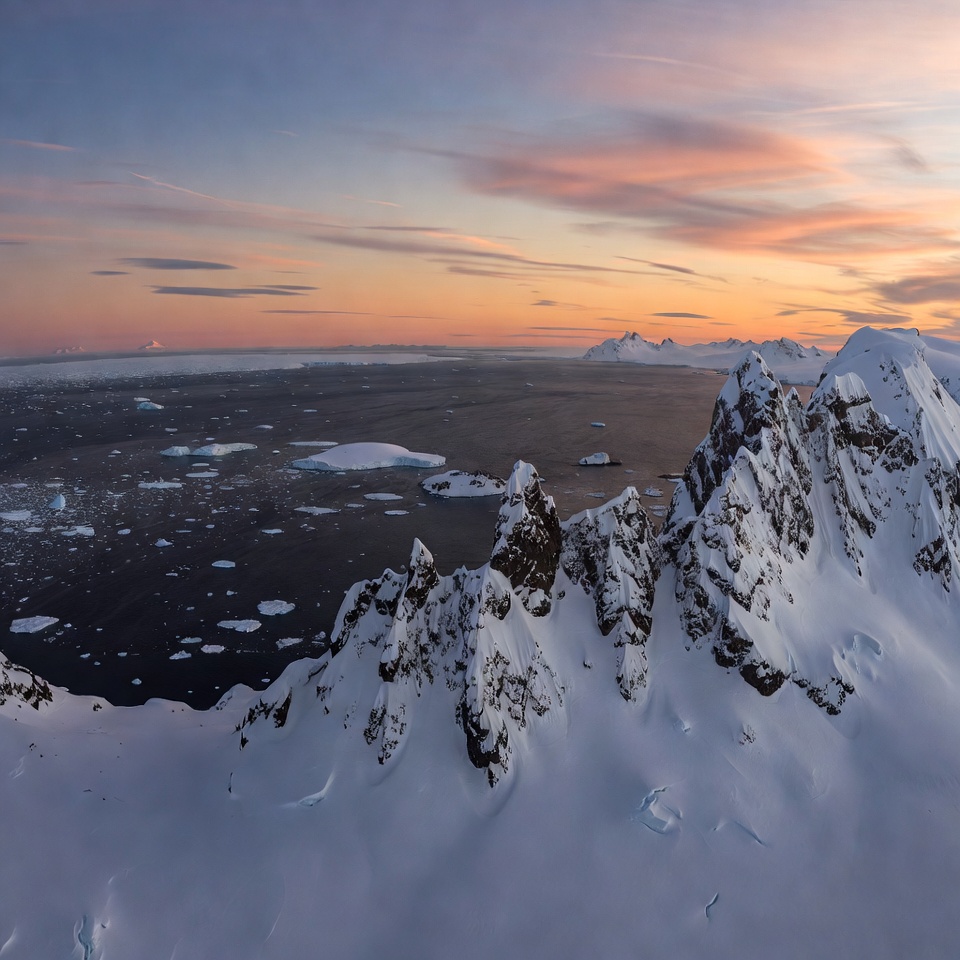 aerial view, blue water, clouds, cold climate, dramatic sky, fjord, frozen sea, glacier, ice floes, icebergs, jagged peaks, mountains, nature, ocean, orange sunset, pink sky, polar landscape, rocky cliffs, sky, snow, sunset, white snow, wilderness, Antarctica