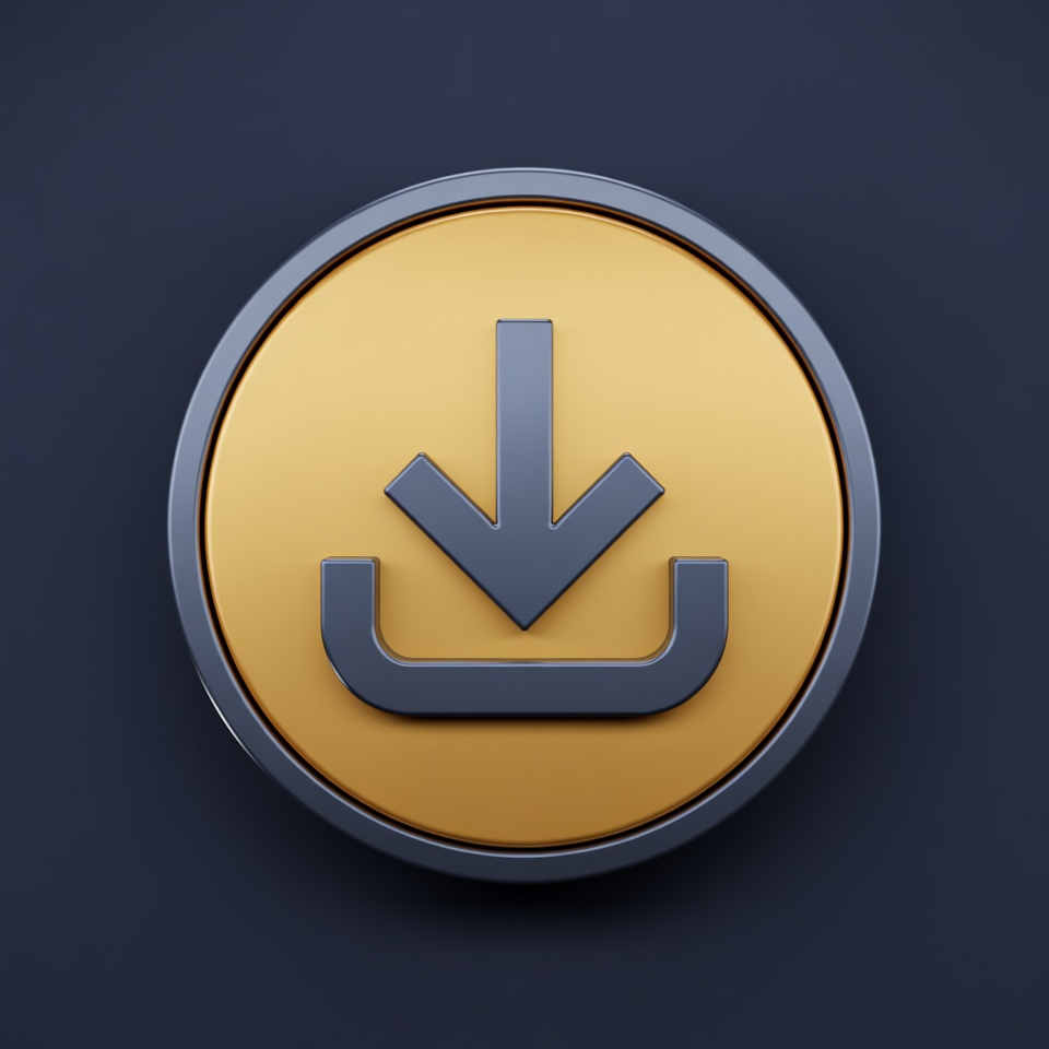 3D icon, app icon, arrow icon, download button, download symbol, downward arrow, glossy icon, gold button, gray arrow, isolated background, metallic rim, navy background, vector icon, yellow circle, download icon