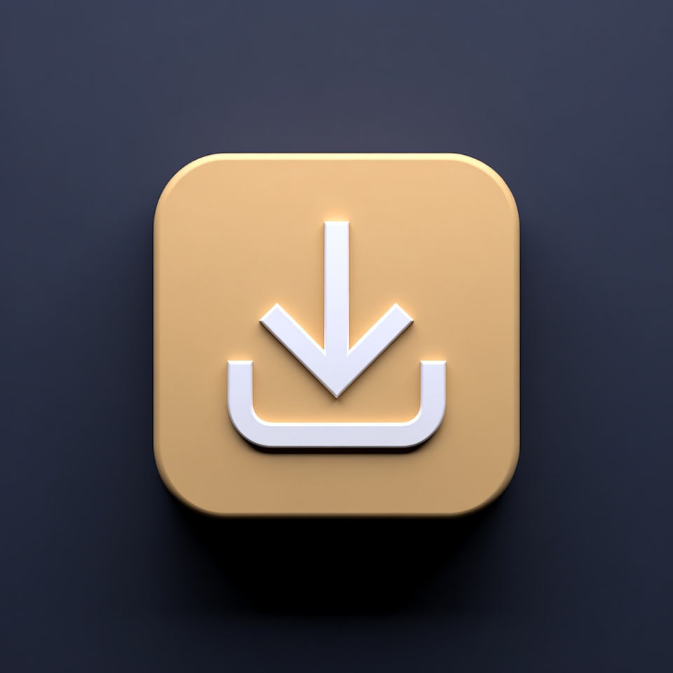 A 3D yellow square app icon features a bold white download arrow pointing downward. The arrow has a curved base resembling an open tray. The icon is rendered with realistic shading on a dark blue background.