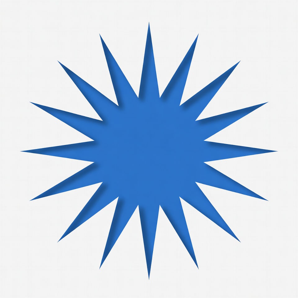 A vibrant blue starburst shape with sharp, pointed rays extends outward on a white background. The design features a bold, symmetrical pattern with a solid blue fill and clean edges.