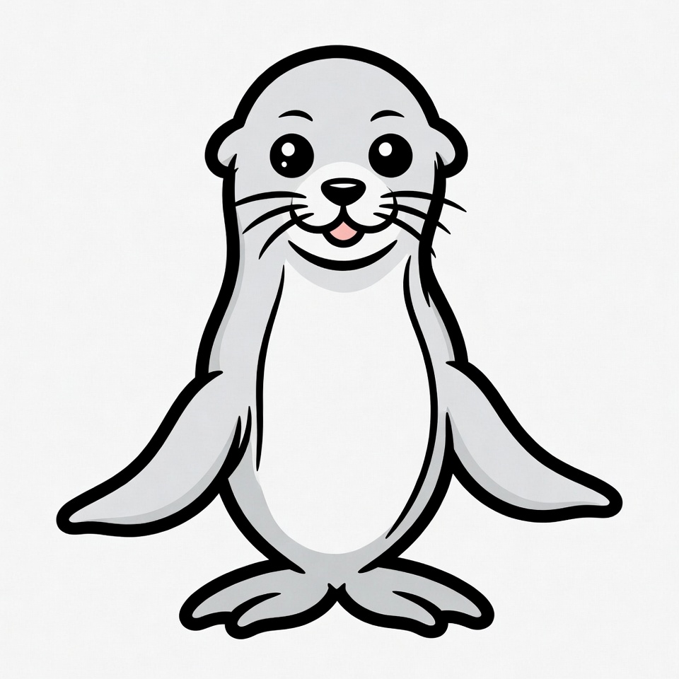 A cute cartoon illustration of a baby seal stands on a white background. The seal has large expressive eyes, a smiling mouth, and flippers outstretched. It features a gray body with white underbelly and black outlines.