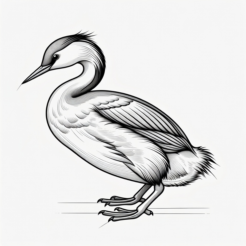 bird, bird illustration, bird standing, black and white, crest, feathers, grebe bird, illustration, ink drawing, isolated background, line drawing, long beak, tail, water bird, white background, wildlife art, wings, grebe