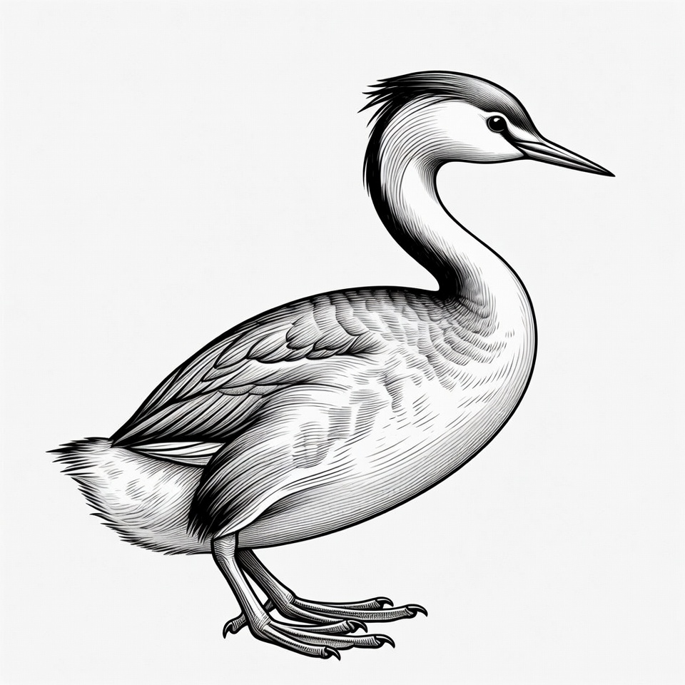 avian, bird, black and white, crest, detailed drawing, feathers, grebe, illustration, isolated background, line drawing, ornithology, standing, vector art, water bird, wildlife, great crested grebe