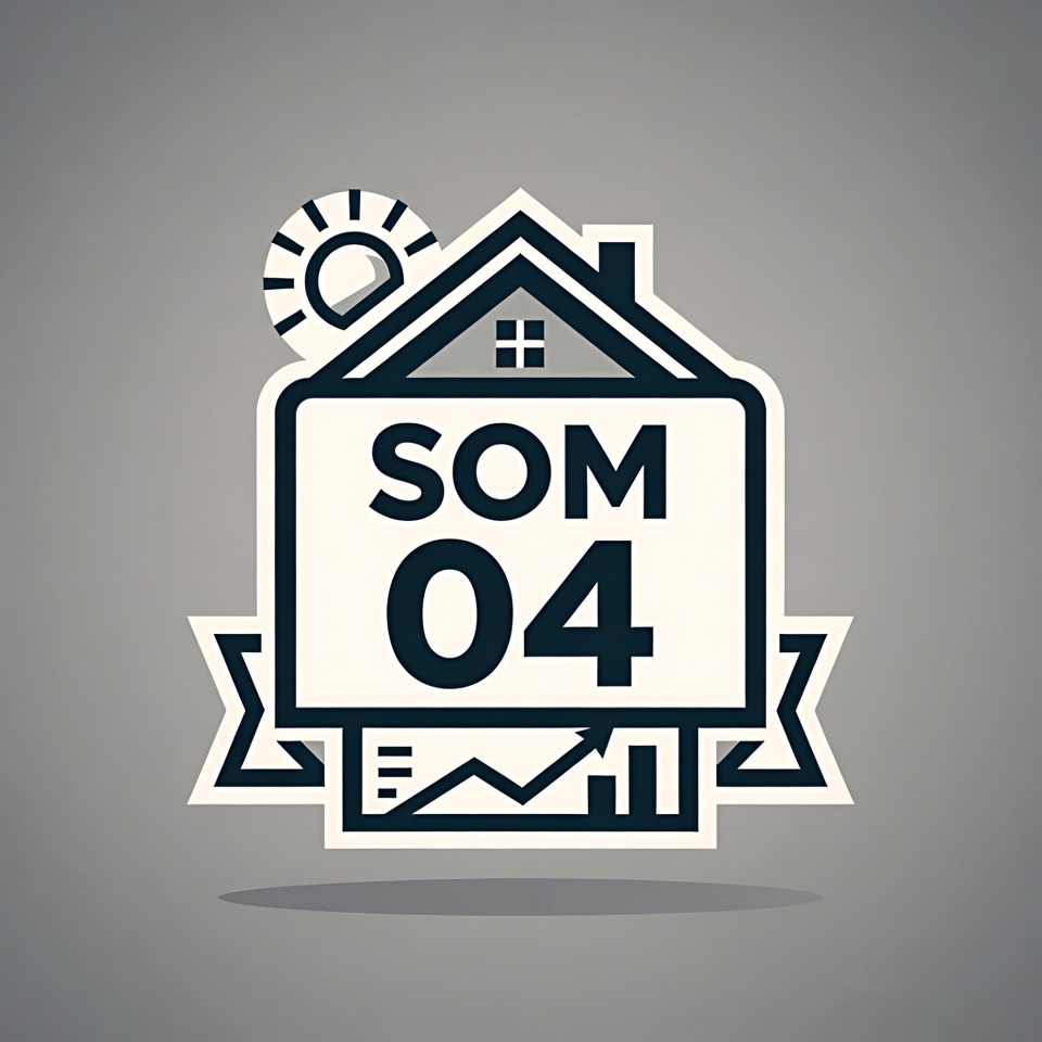 A line art illustration of a house with a shining sun above it on a gray background. A white sign in front displays 'SOMOM 044' with ribbon accents and a graph showing upward trends below. The design features clean outlines and a subtle drop shadow.