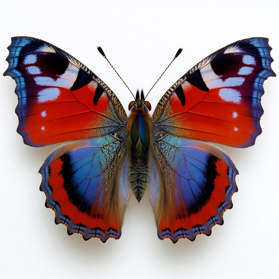 A vibrant peacock butterfly with wings fully spread displays striking red, blue, and black patterns. The wings feature prominent eye-like spots and scalloped edges. It is positioned against a plain white background.