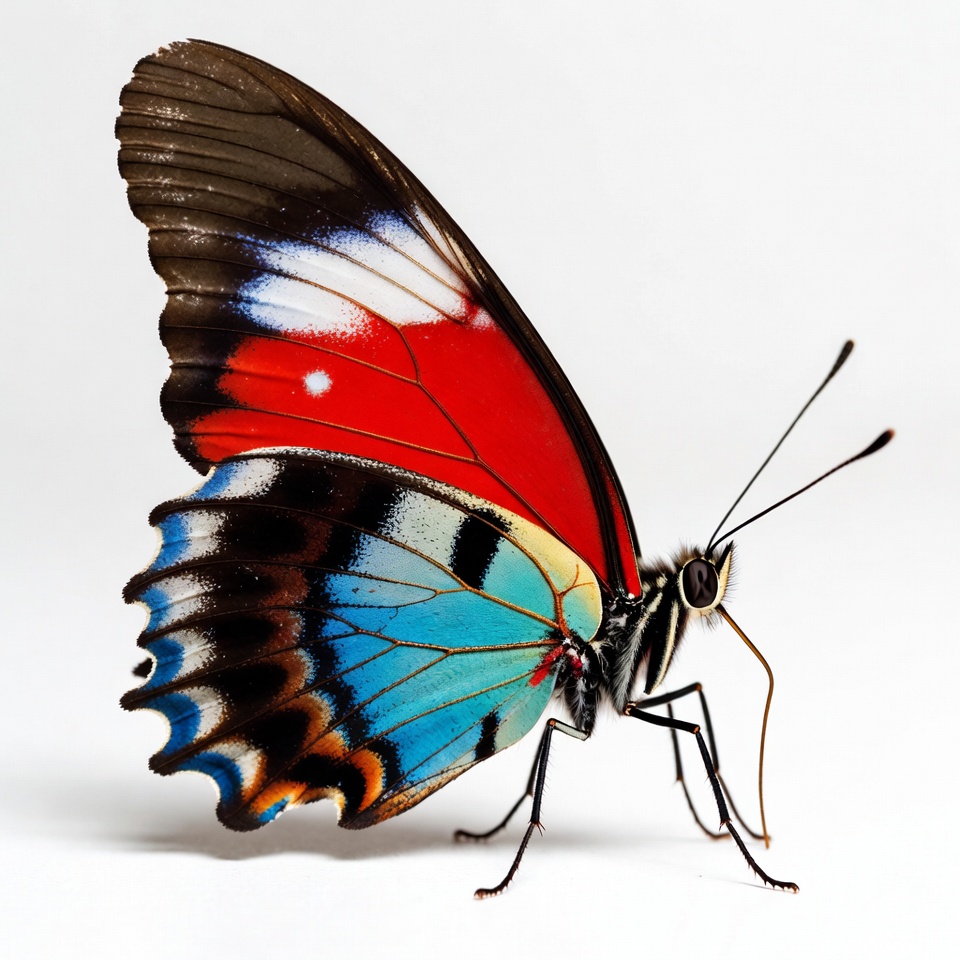 A vibrant butterfly with striking multicolored wings displays red, blue, white, and black patterns. Its wings are spread open against a plain white background. The intricate details on the wings and slender body are clearly visible.