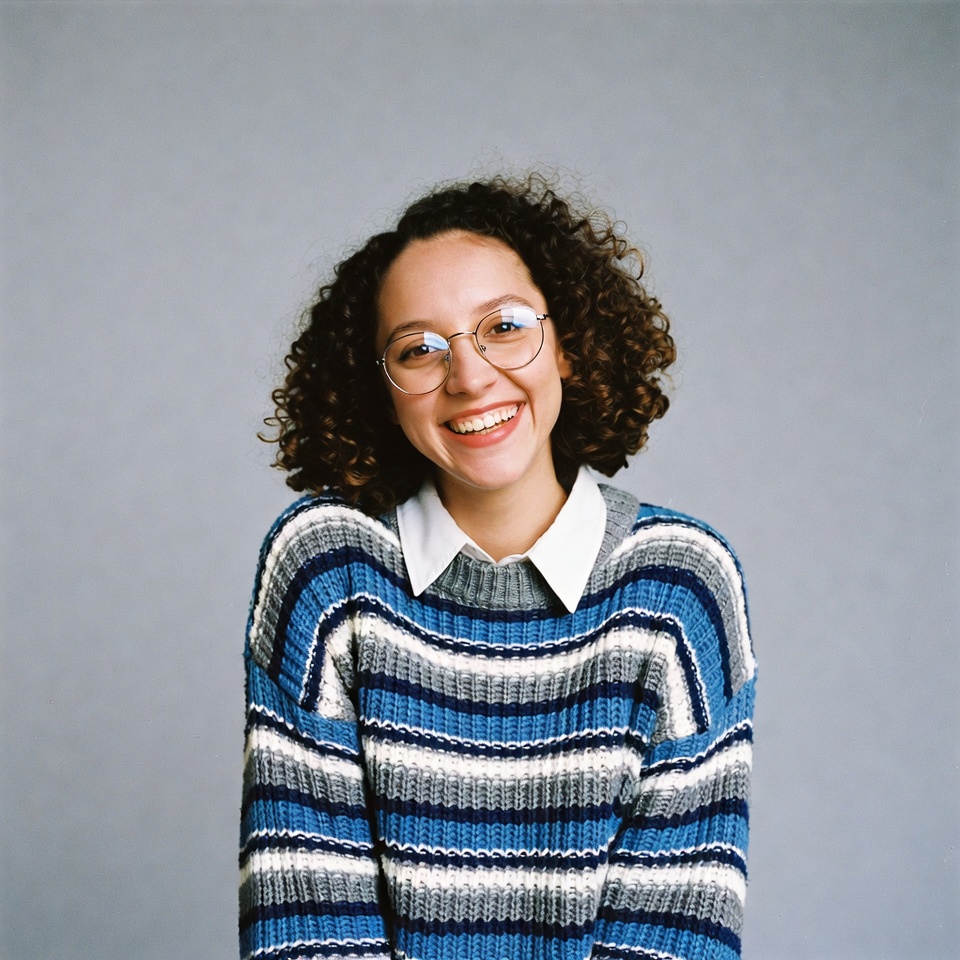 A young woman with curly dark hair smiles broadly at the camera while wearing round glasses. She has on a blue and white striped sweater over a white collared shirt. The image is set against a plain gray background.