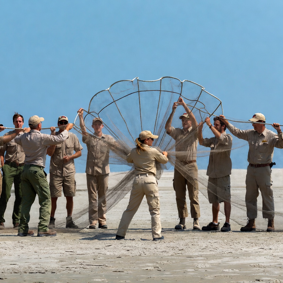 A diverse group of eight people in khaki uniforms stands on a sandy beach under a clear blue sky, collectively holding a large wide fishing net spread open. The group includes several men and one woman at the center, all wearing caps and engaging in the activity. The net is prominently displayed in the foreground against the beach and ocean backdrop.