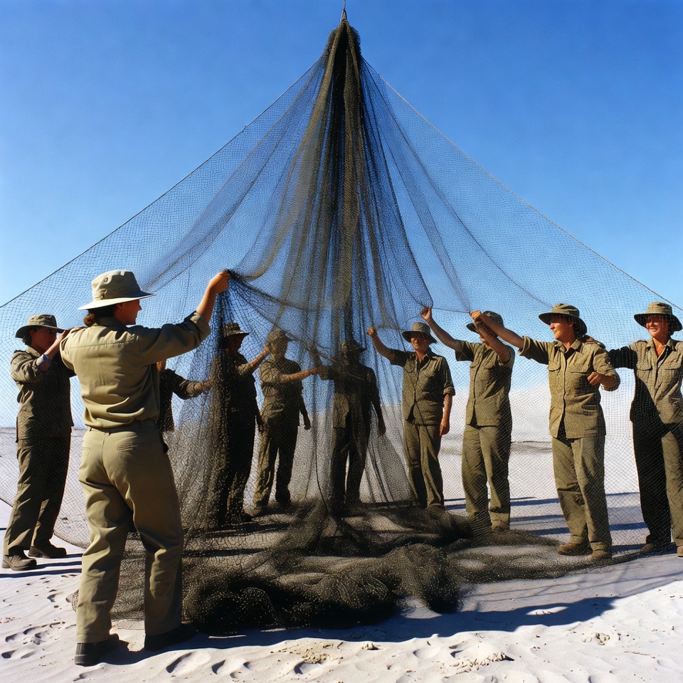 Eight men in khaki uniforms and hats stand on a sandy beach, collectively holding up a large conical black fishing net. The net forms a tall pyramid shape against a clear blue sky. They appear to be preparing or displaying the net outdoors.