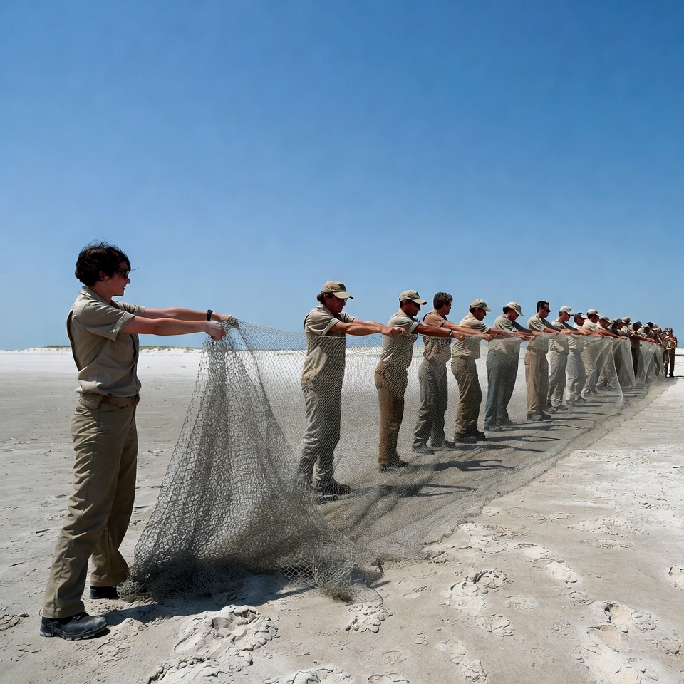 A group of men in khaki uniforms stands in a line on a sandy beach, pulling a large fishing net spread out in front of them. They wear caps and focus on hauling the net under a clear blue sky. The scene shows a long line of men cooperating on the white sandy shore.