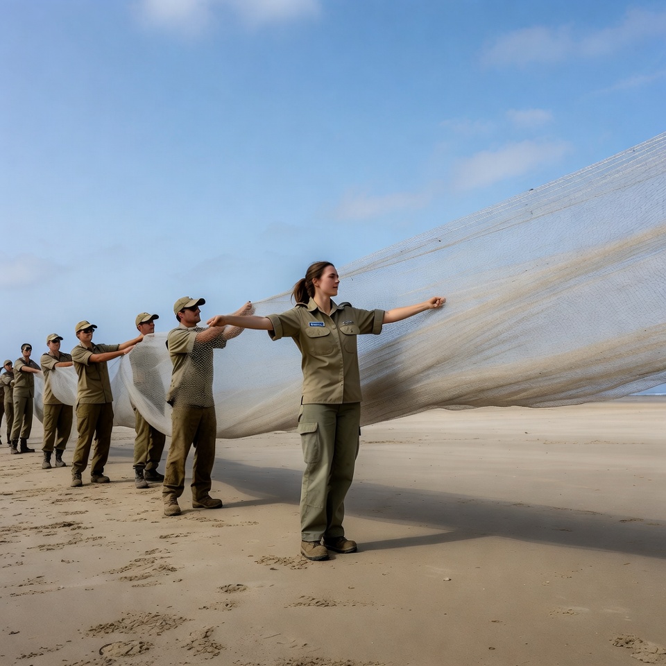 A group of park rangers in khaki uniforms stands in a line on a sandy beach, collaboratively pulling a large white fishing net. The central woman with brown hair extends her arms wide to hold the net, while men on both sides assist under a clear blue sky. Footprints are visible in the sand around their boots.