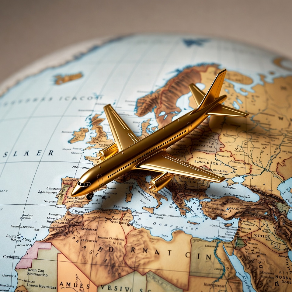 A small golden toy airplane is positioned on top of a large globe, with its nose pointing towards Europe on the map. The globe shows detailed continents including Europe, Africa, and parts of Asia. The airplane and globe are centered against a plain background.
