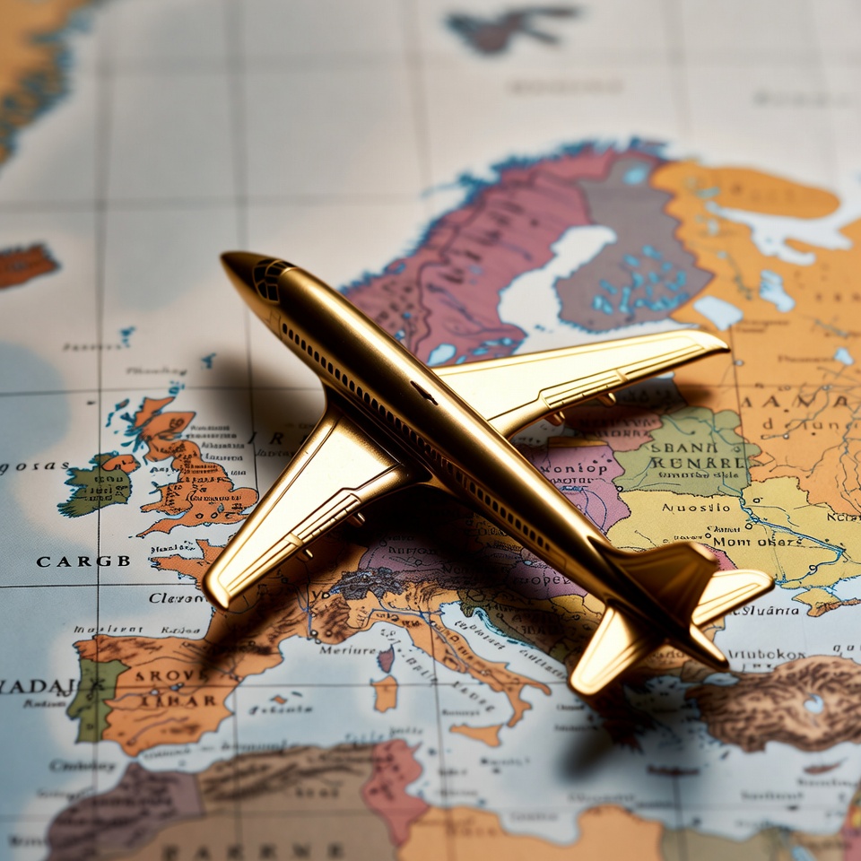 A small golden toy airplane is positioned on a colorful world map highlighting Europe. The plane points eastward over countries like Romania, Ukraine, and Russia. The image features a flat map background with the airplane as the central focus.