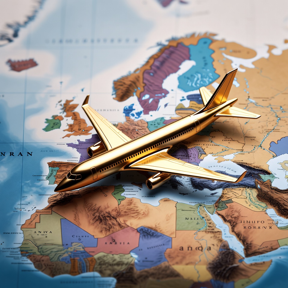 A small golden toy airplane is positioned on a colorful world map, with its nose pointing towards Europe. The map shows detailed continents in various shades of blue, green, purple, and red. The airplane features shiny metallic wings and fuselage against the textured map background.