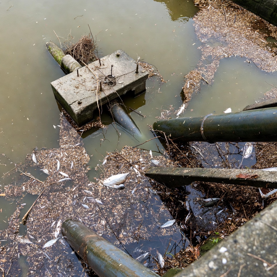 aquatic pollution, concrete platform, contamination, debris, drainage, environmental damage, filth, fish carcasses, garbage, green water, industrial waste, murky water, overflow, pipe outlet, polluted water, pollution, runoff, rusty pipes, scum, sewage, sewer pipes, sludge, water edge, waterway, dead fish