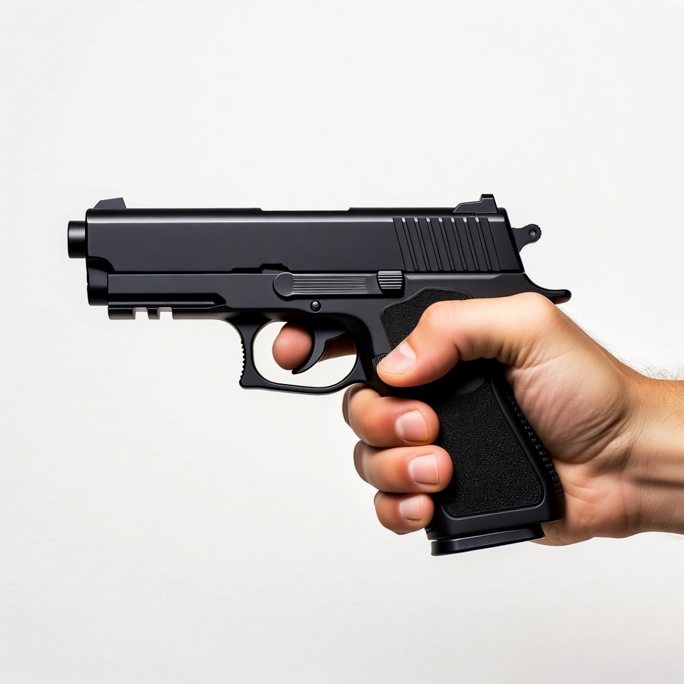 Man's hand holding black pistol