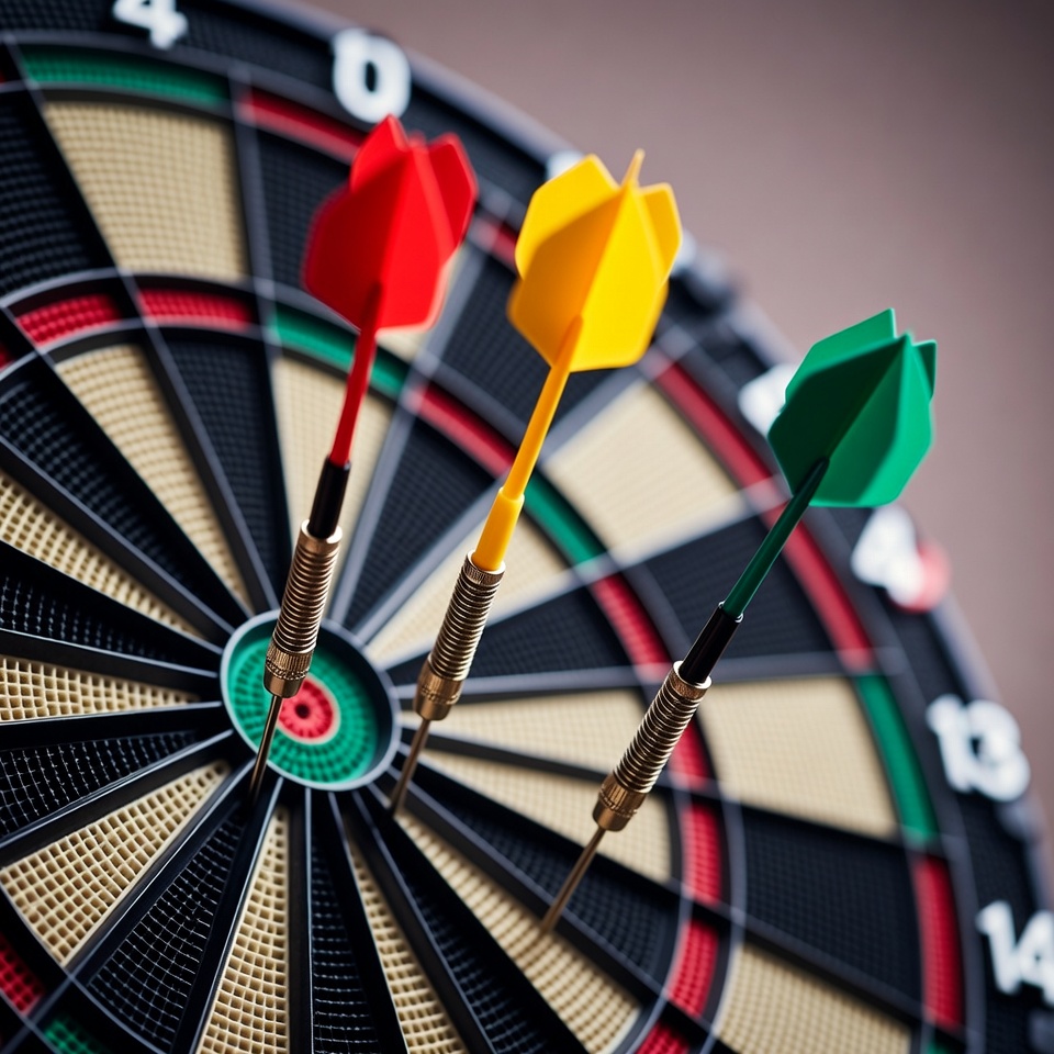 A close-up view of a traditional dartboard with three darts stuck in it. The darts feature red, yellow, and green flights and are positioned near the center. The dartboard displays black and white segments with numbered sections.