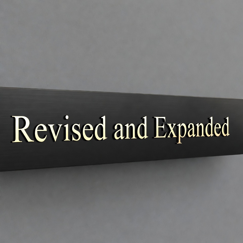 A metallic sign with the gold-embossed text 'Revised and Expanded' is mounted on a black background. The letters are raised and shiny, reflecting light against the dark surface. The sign is isolated on a gray backdrop.