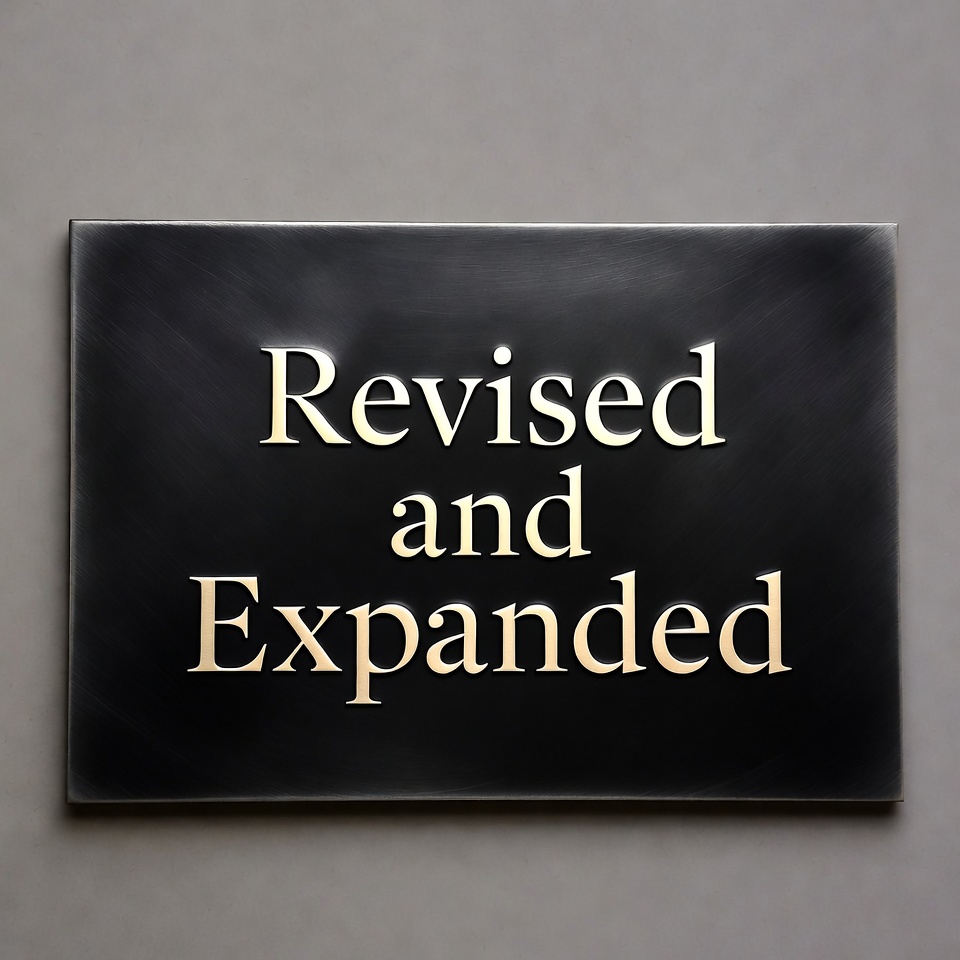 A black rectangular plaque features the words 'Revised and Expanded' in large, elegant gold lettering. The text is raised and metallic, set against a dark background. The sign is centered on a gray surface.