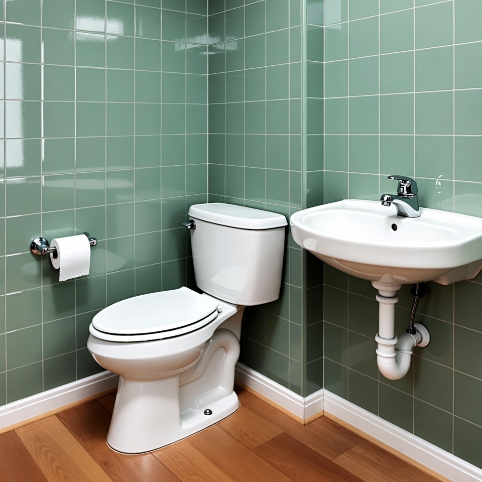 bathroom interior, chrome faucet, clean bathroom, corner bathroom, glossy tiles, green bathroom, green tiles, modern bathroom, pedestal sink, roll holder, sanitary ware, sink, small bathroom, tiled walls, toilet, toilet paper, white porcelain, white toilet, wooden floor, bathroom