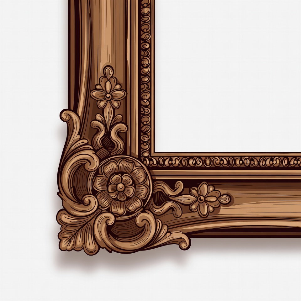 An ornate wooden picture frame with intricate floral carvings and scrollwork is depicted in a detailed vector illustration. The frame features elaborate designs including flowers and leaves along its edges. It stands against a plain white background.