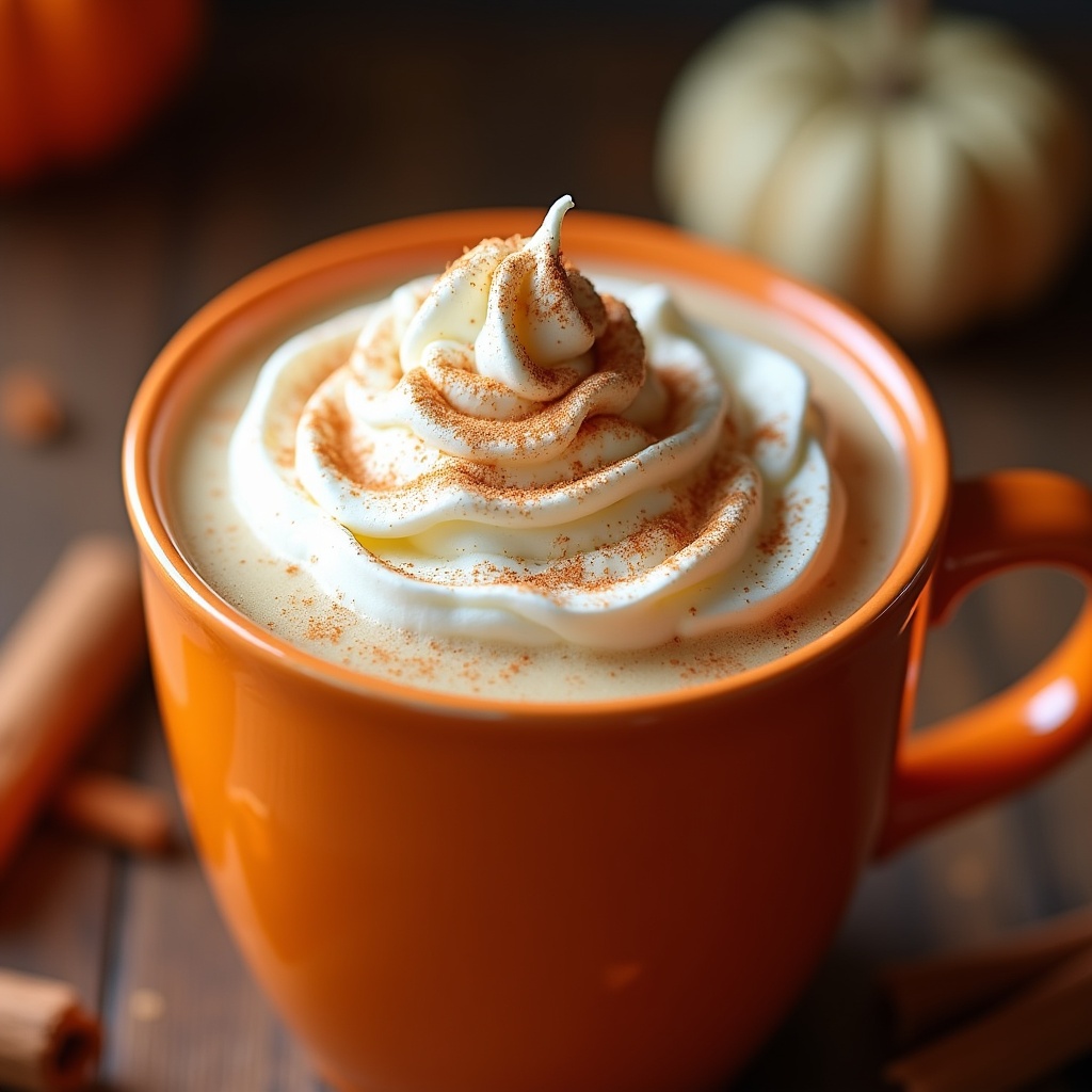autumn drink, cinnamon dusting, cinnamon sticks, cozy drink, creamy latte, fall drink, holiday beverage, hot beverage, nutmeg sprinkle, orange cup, orange mug, pumpkins, seasonal latte, small pumpkins, spiced latte, steam rising, whipped cream, white cream, wooden table, pumpkin spice latte