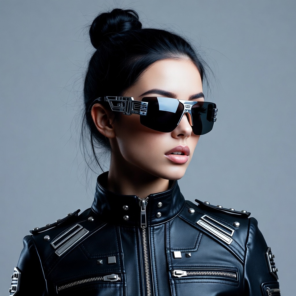 A young Asian woman with black hair in a bun wears oversized metallic futuristic sunglasses and a black leather jacket with silver accents. She gazes slightly to the side with glossy lips, posed against a plain gray background. The outfit features cyberpunk-style studs and zippers.