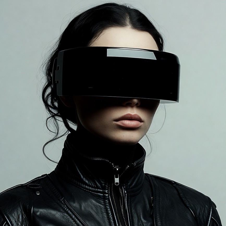 A woman with long black hair wears a shiny black VR headset covering her eyes. She has subtle lipstick and stands against a plain gray background. She is dressed in a black leather jacket with a high collar.
