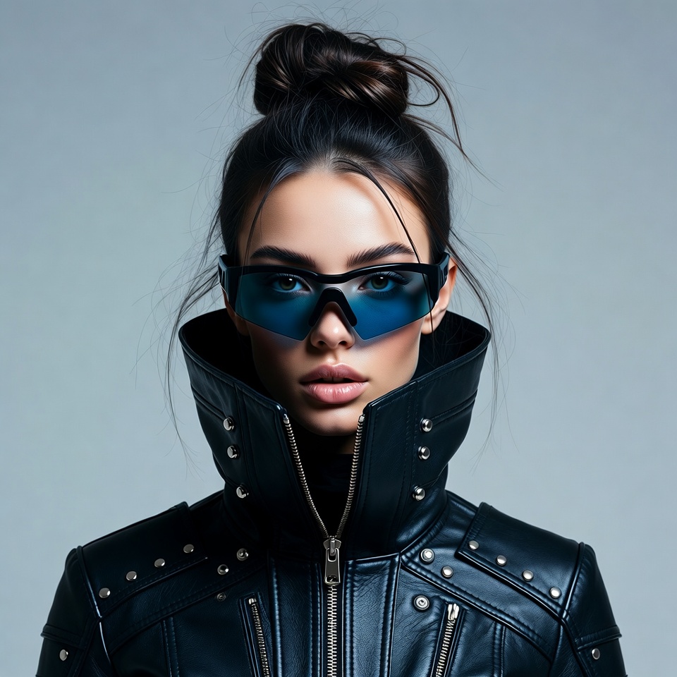 A young woman with dark hair in a bun wears futuristic blue-tinted sunglasses and a black leather jacket with a high studded collar. She gazes directly at the camera with a subtle pout on a plain gray background. The jacket features a zipper and multiple decorative studs.