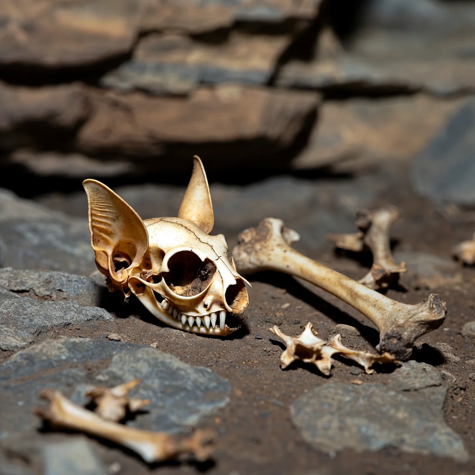 A detailed cat skull with prominent pointed ears rests on a rocky surface surrounded by scattered animal bones. The skull features empty eye sockets and visible teeth, set against a dark, earthy background of stones and dirt. The bones include ribs, leg bones, and smaller fragments.