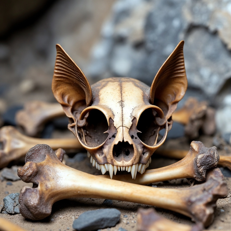anatomy, animal skull, bat, bones, crossed bones, detailed skull, eye sockets, fangs, fossil, halloween skull, isolated skull, mammal skull, pirate skull, pointed ears, prop, rocky background, skull, skull and bones, wooden bones, bat skull