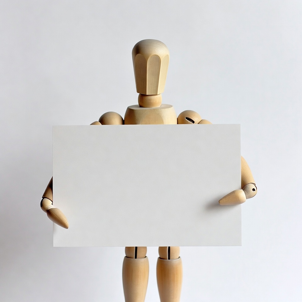 advertising mockup, arms raised, artist mannequin, blank placard, blank sign, holding sign, isolated background, joints, poseable figure, studio shot, toy figure, white background, white sign, wooden doll, wooden mannequin