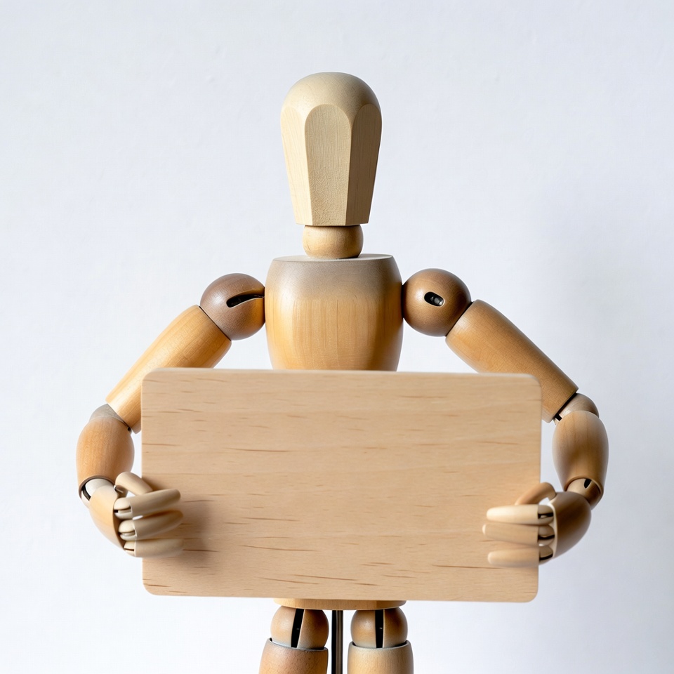 Wooden mannequin holding blank sign