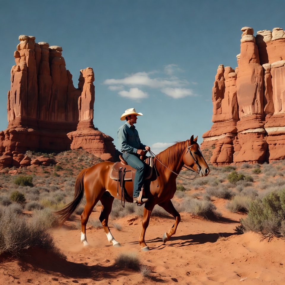 A man wearing a white cowboy hat and blue shirt rides a brown horse through a sandy desert landscape. Towering red rock formations rise dramatically in the background under a clear blue sky. The horse walks steadily with the rider holding the reins.