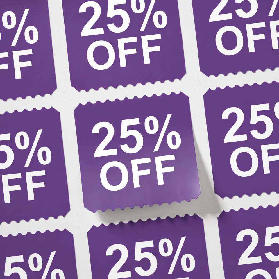 bargain, coupon grid, deal, discount coupon, discount label, marketing graphic, offer badge, percent off, perforated edge, promotion, purple background, purple coupon, retail sale, sale badge, sales tag, shopping discount, voucher, white background, white text, 25% off