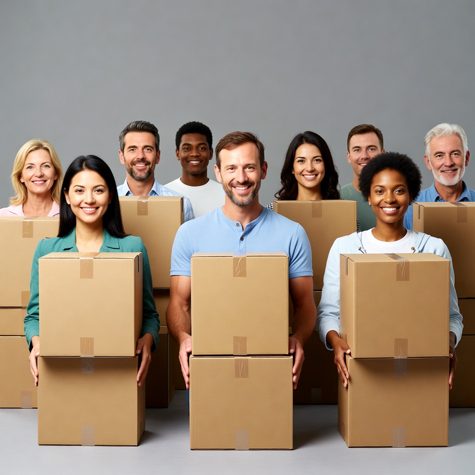 Diverse group holding cardboard boxes