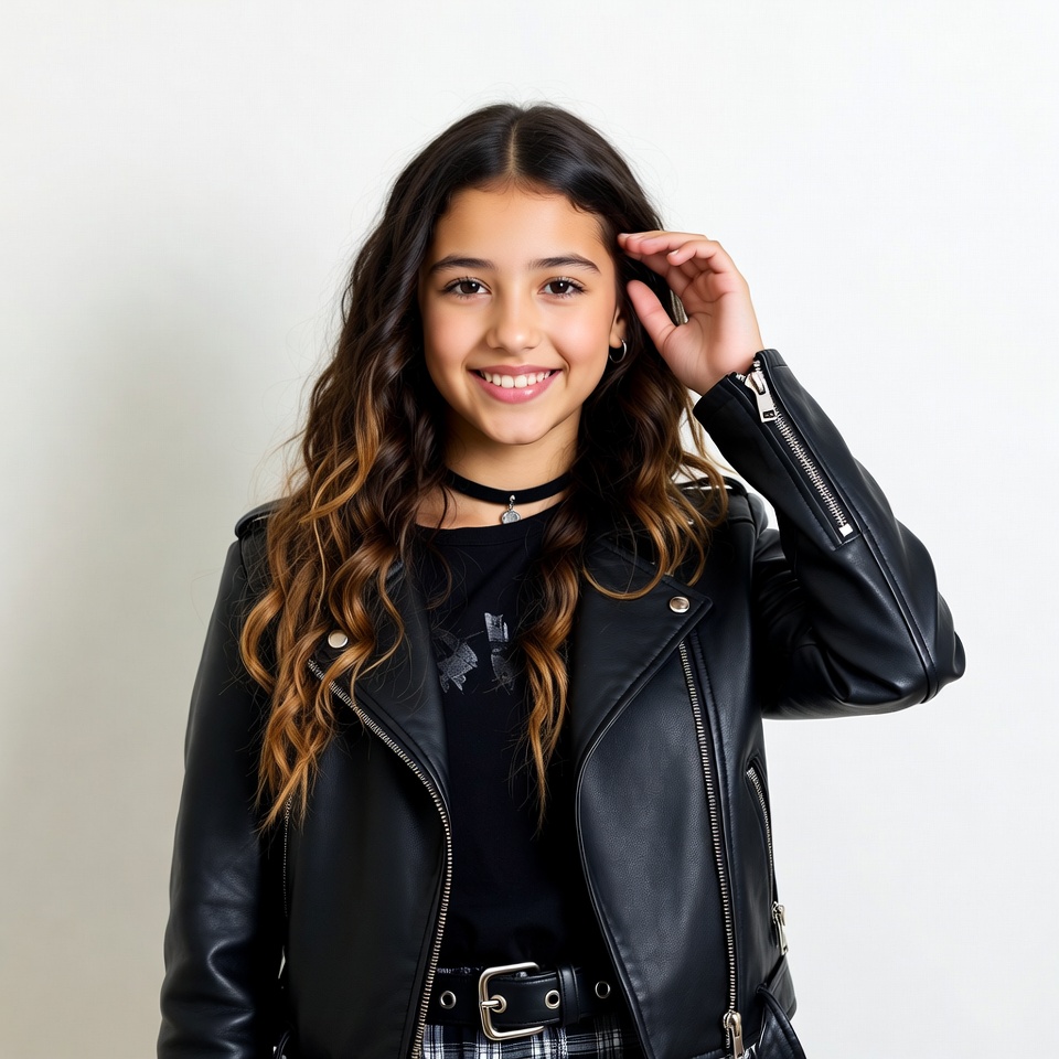A young girl with long wavy brown hair smiles at the camera while touching her ear. She wears a black leather jacket over a graphic t-shirt, a choker necklace, and a plaid skirt with a belt. She poses confidently against a white background.