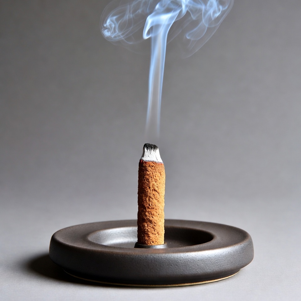 A lit incense stick with a glowing orange tip emits a thin trail of white smoke upward. The stick rests in a black ceramic incense holder on a plain gray background. The textured brown incense contrasts with the smooth dark holder.