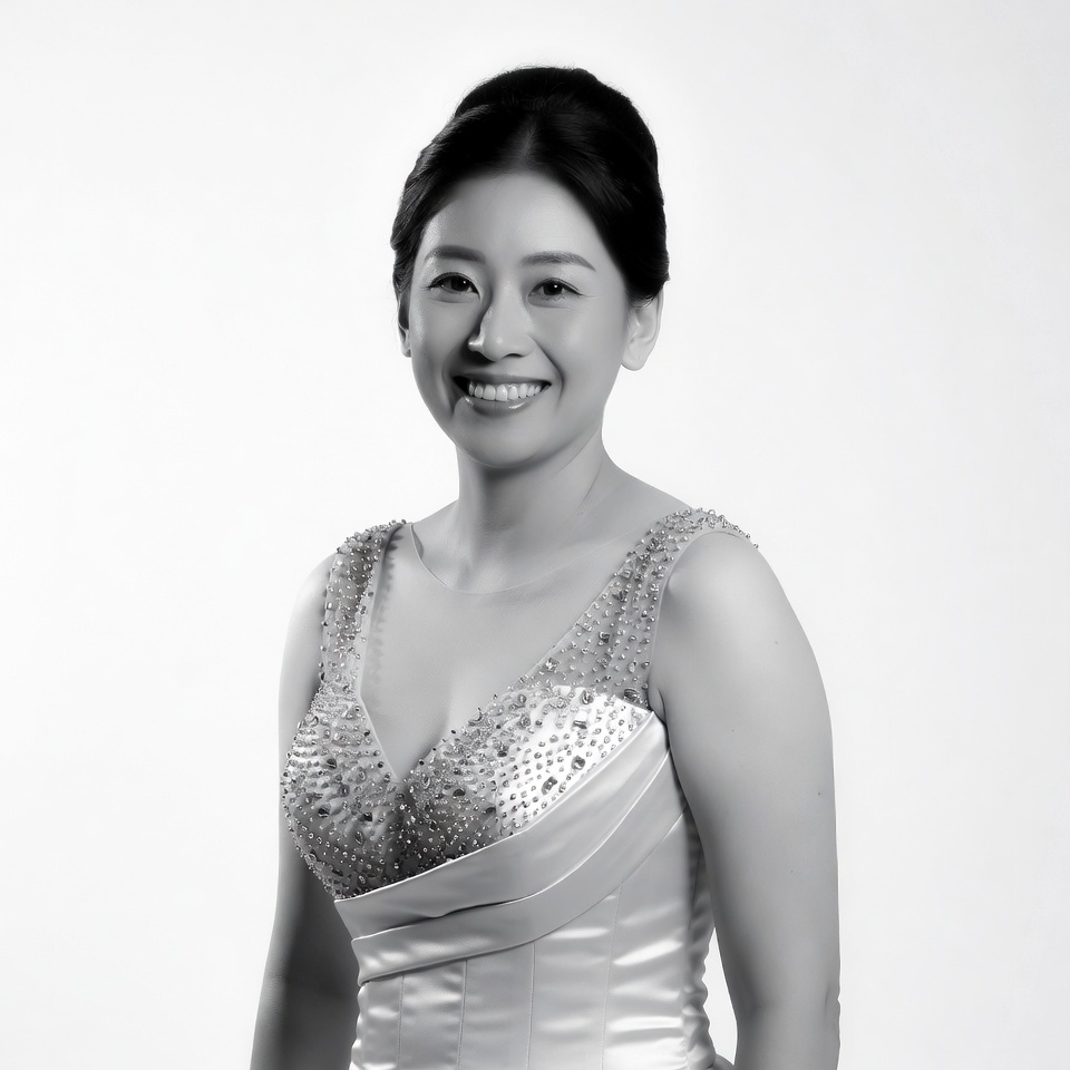 A young Asian woman with black hair in an updo smiles warmly at the camera. She wears a sleeveless satin gown with intricate beading on the deep V-neckline and straps. The portrait is in black and white against a plain white background.