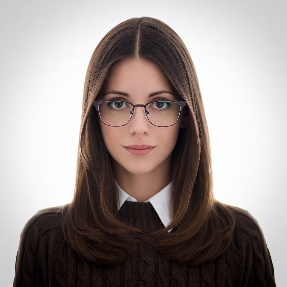 A young woman with long straight brown hair wears thin metal-framed glasses and gazes directly at the camera. She has a collared white shirt under a brown cable-knit sweater. The portrait is set against a plain white background.